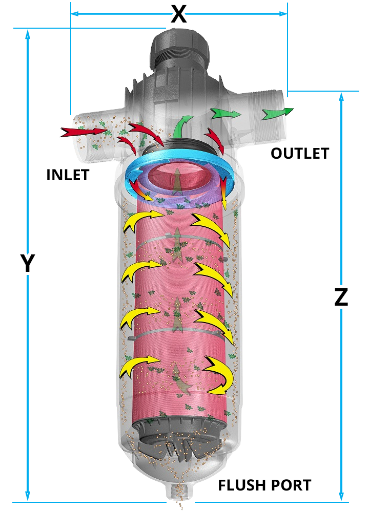 Model Number | Model Type | Inlet/Outlet Size & Type | Filter Surface Area (sq. in.) | Flush Port Connection Size | Maximum Flow (GPM) | Maximum Pressure Rating (PSI) | X | Y | Z |